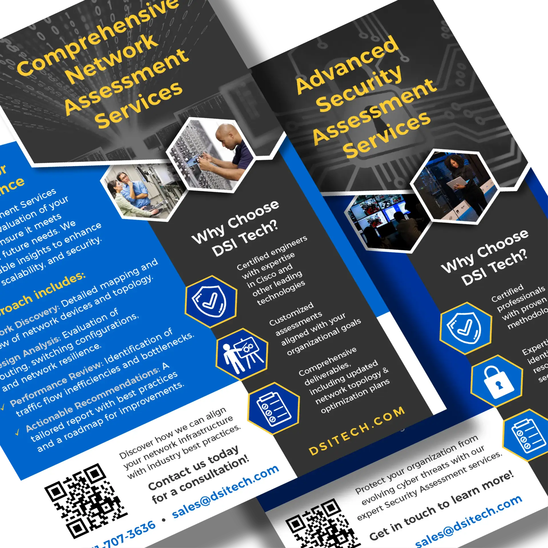 Vendor handouts on the topics of network and security assessments were complicated with too much information. The IT and sales teams needed clear, visual ways to explain the Network and Security Assessment programs that were concise, easily read, with straightforward calls to action. I designed each handout with a connected design and layout to be part of a series of services handouts.