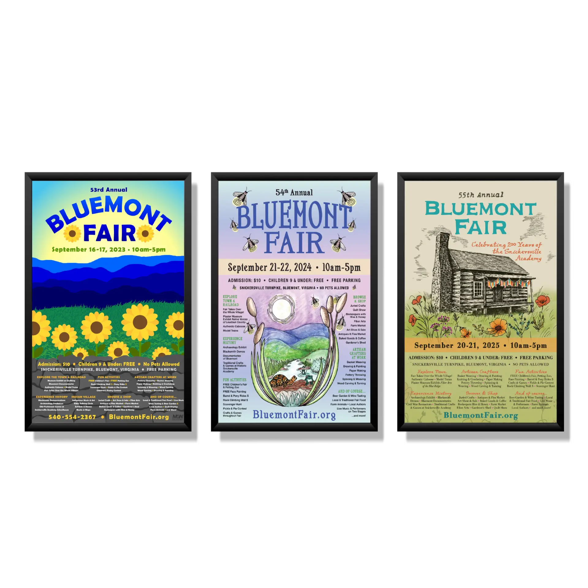 In 2023, I won the art contest for the Bluemont Fair (very exciting!) and created the poster layout. I was invited to be the Graphics Chair and volunteer my time to create and manage everything visual.